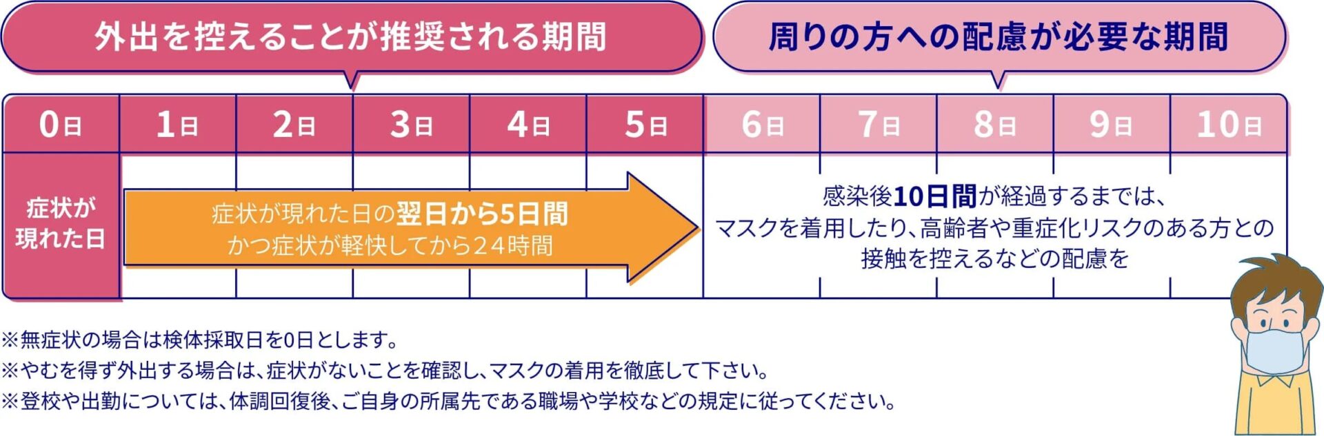 また、発症後10日が経過するまでは、マスクの着用や、高齢者や基礎疾患のある方などとの接触を控えるなど、