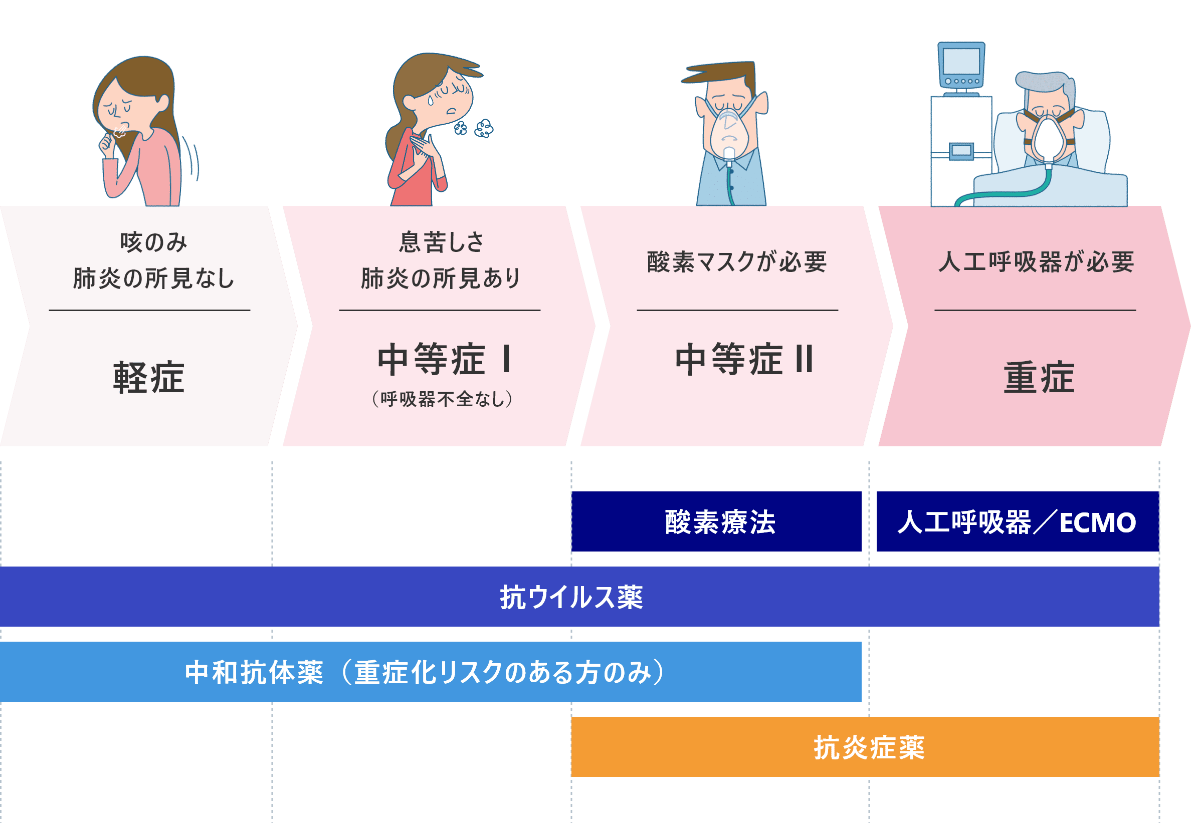 新型コロナウイルス感染症の治療方針は、症状の重さによって決まります。